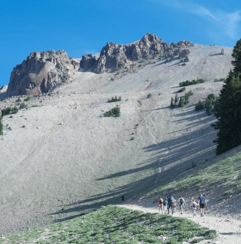 Lassen Peak’s upper switchbacks — where the trail cuts a scar into the mountain, and a shaded sign warns: “Stay on the trail.” The path veers right, behind the hill and the trees.