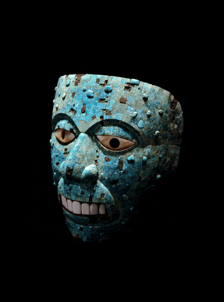 Mask of Xiuhtecuhtli, Aztec god of fire and renewal — turquoise, cedarwood, shell, and flaking gold leaf — elements of earth transformed into spirit. (British Museum)