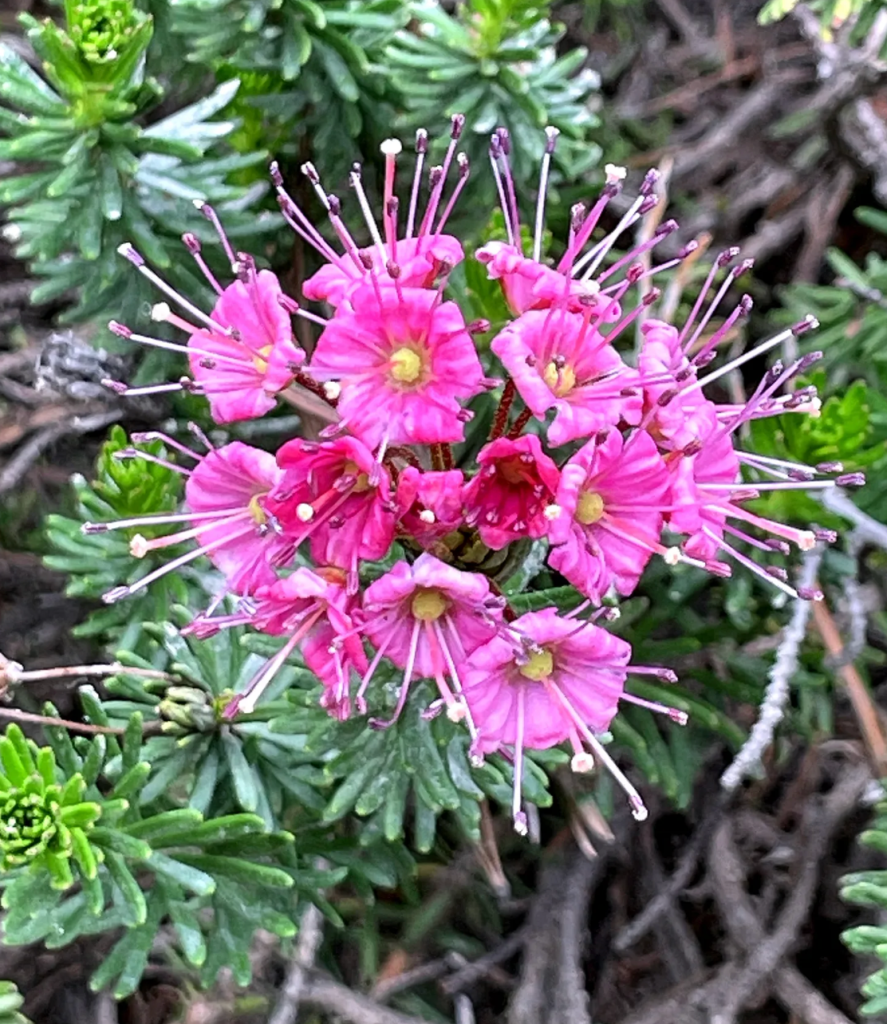 Each stem is densely covered with leathery, needle-like leaves, and can support from one to thirty flowers. They rise from an old woody clump that spreads across the mountain soil, creating shade and preventing evaporation.
