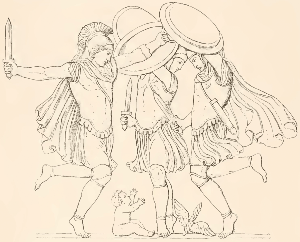 Meanwhile, hidden in his cave—a quickening god of a new generation, forced into the womb of the earth—Zeus cries for his mother. To mask the sound, the Curetes coordinate. They clash their bronze shields and spears in a rhythmic, warlike dance, raising a thunderous din.