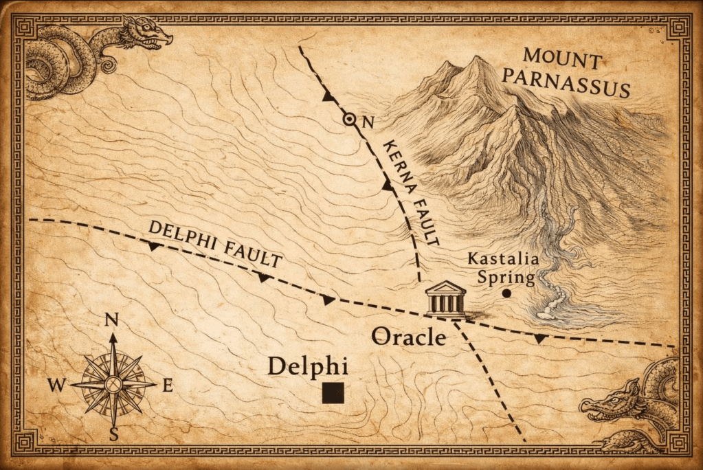 Geologists have since discovered that Mount Parnassus is laced with fault lines. Two intersect where Zeus’s eagles were said to have met—where the omphalos marked the world’s navel—where the Delphi and Kerna faults meet.